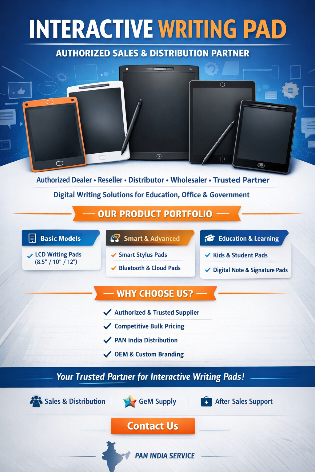 We deliver advanced Interactive Writing Pad solutions across India as an Interactive Writing Pad authorized partner, dealer, distributor, reseller, wholesaler and system integrator, offering end-to-end Interactive Writing Pad installation, configuration and commissioning for Central & State Government departments, PSUs, Smart City education projects, corporate offices, training centers, boardrooms, schools, colleges, universities, hospitals and digital learning & hybrid classroom environments across Pan India.