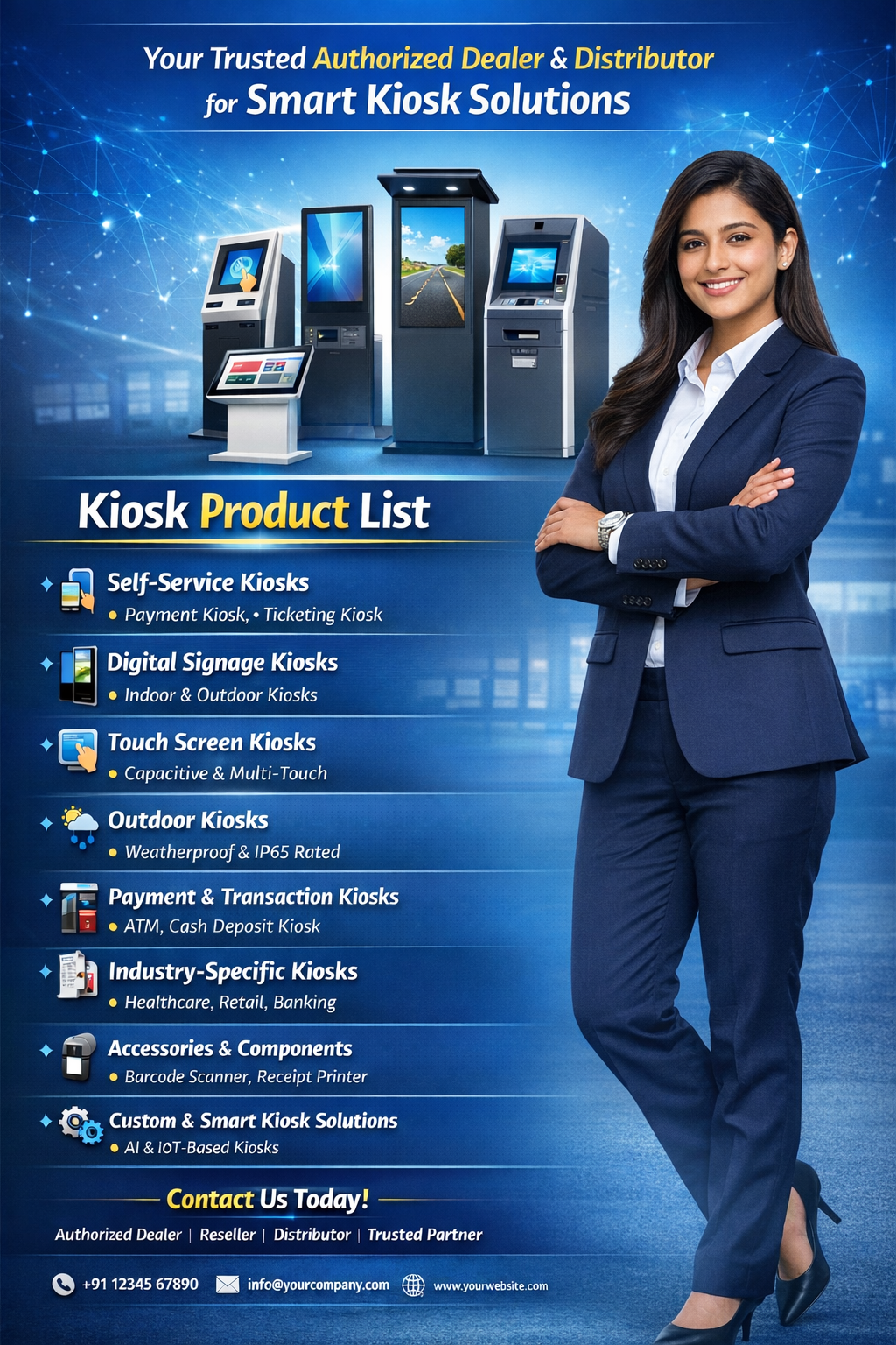 We provide comprehensive Kiosk solutions across India as an authorized Kiosk partner, dealer, distributor, reseller and wholesaler, supplying reliable interactive kiosks, self-service kiosks, payment kiosks, information kiosks, digital signage kiosks, token management kiosks, POS kiosks, industrial kiosks and customized kiosk systems for corporate offices, banks, airports, hospitals, schools, universities, retail stores and Smart City projects across Pan India.