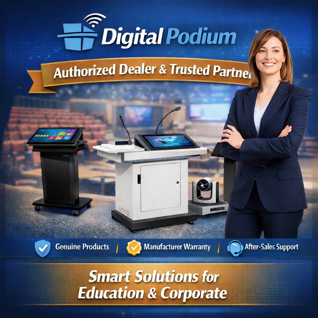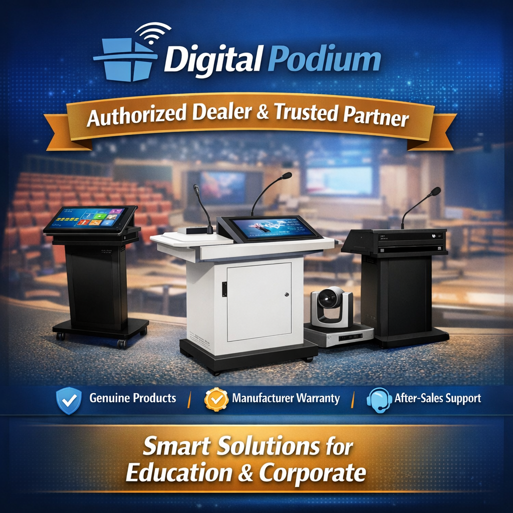 We supply interactive podiums, smart classroom podiums, AV integrated podium systems, lecture podiums and auditorium podiums with genuine OEM warranty, professional installation and fast Pan-India delivery.