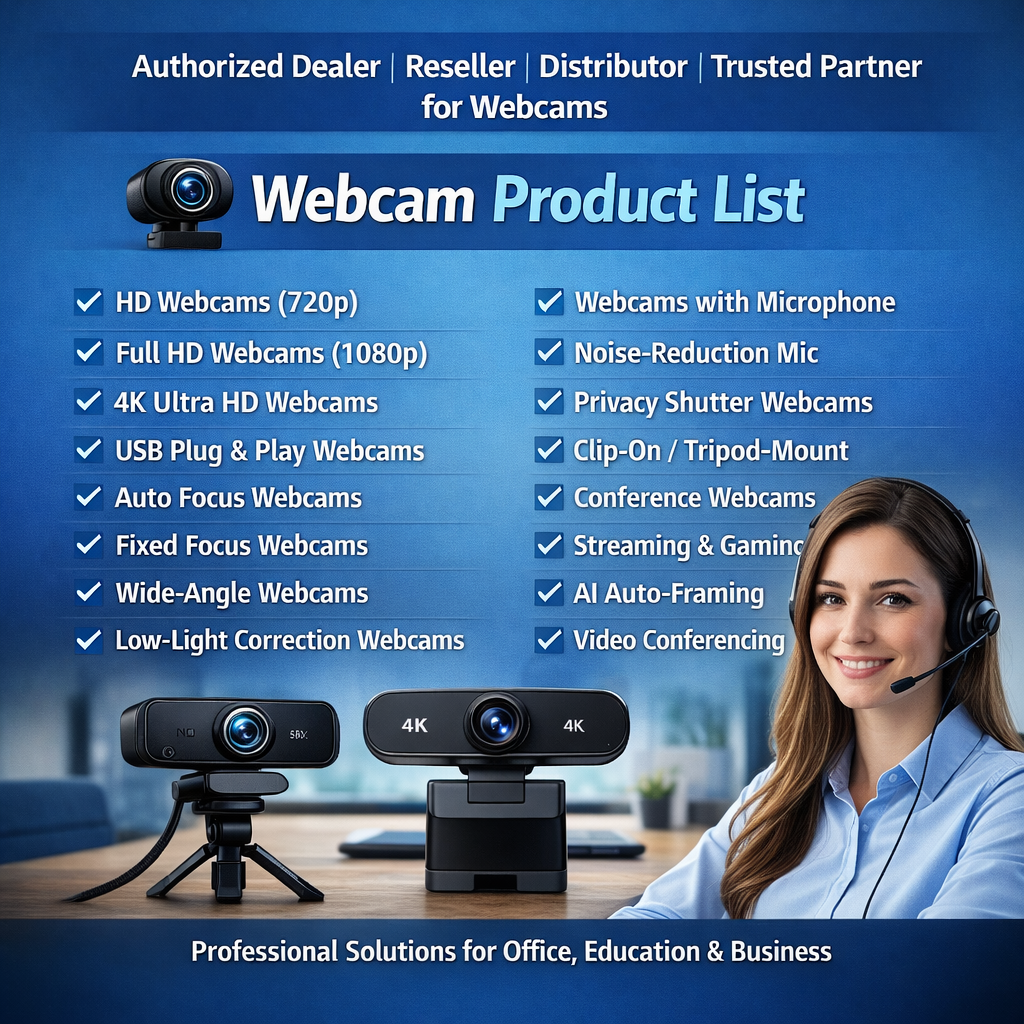 We also supply professional webcam and video conferencing solutions including HD webcams, Full HD webcams, 4K webcams, wide-angle webcams, auto-focus webcams, low-light webcams, noise-reduction webcams, conference room webcams, PTZ cameras and professional video conferencing cameras for boardrooms, auditoriums, studios, classrooms, training rooms, control rooms, telemedicine centers and large enterprise collaboration environments.