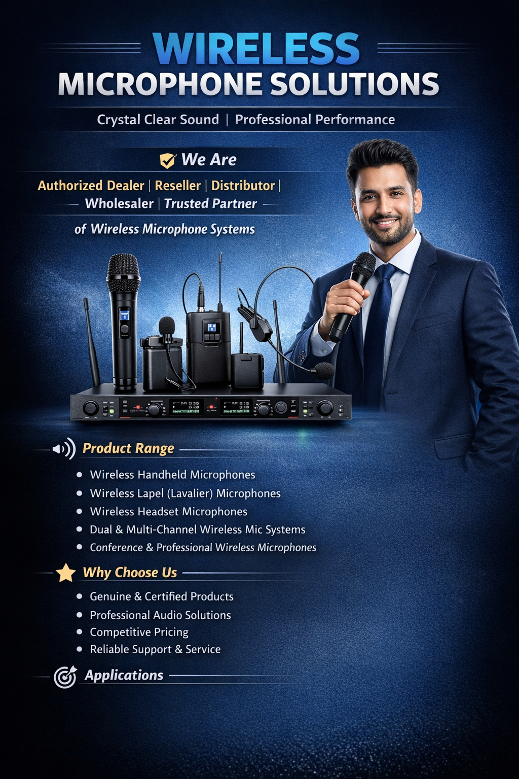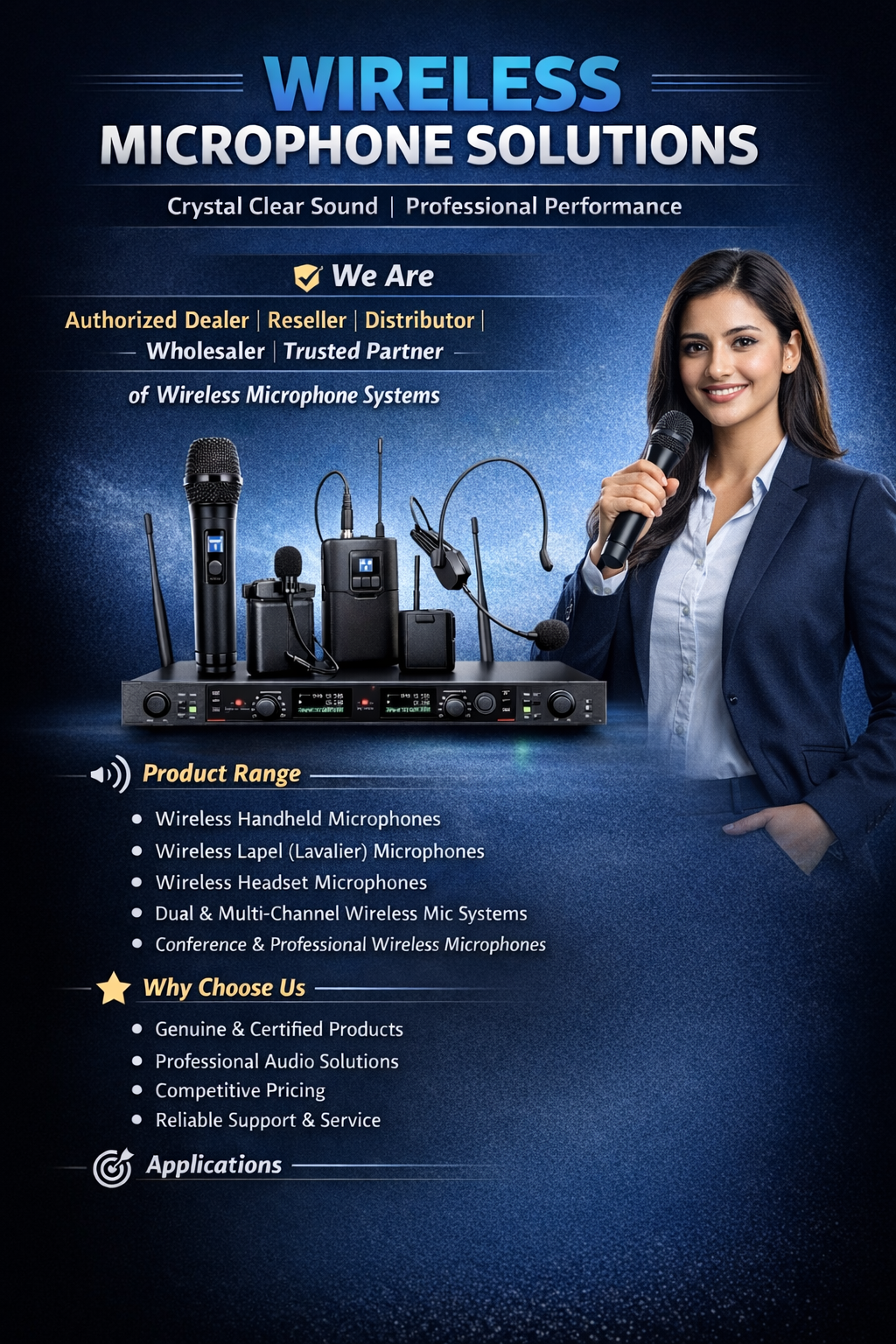 For corporate offices, Central & State Government departments, PSUs, boardrooms, banks, BPOs, call centers, auditoriums and digital workspaces across India, Sunlite Systems Pvt Ltd is a Wireless Microphone Authorized Partner, Wireless Microphone Authorized Dealer, Wireless Microphone Authorized Distributor, Wireless Microphone Reseller, Wireless Microphone Wholesaler, Wireless Microphone Supplier and GeM Registered Wireless Microphone Vendor in India, delivering advanced Wireless Microphone solutions, professional Wireless Microphone display systems, enterprise display platforms and digital workspace display solutions that enable high productivity, superior visual clarity, centralized display control, scalability and clutter-free professional Wireless Microphone environments across Pan India.