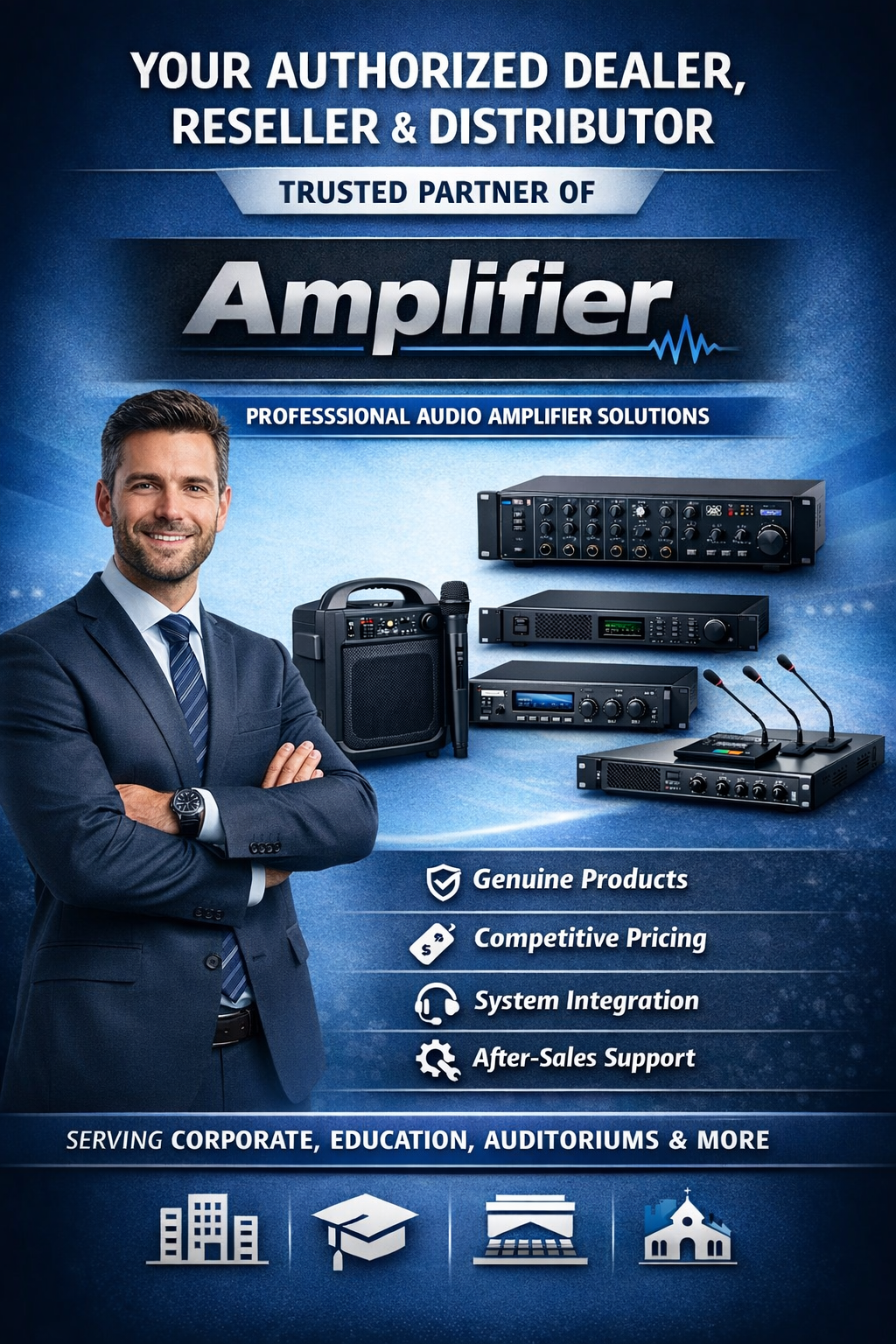 We deliver advanced amplifier solutions and professional audio amplifier systems across India as an amplifier authorized partner, amplifier dealer, amplifier distributor, amplifier reseller, amplifier wholesaler and amplifier system integrator, offering end-to-end amplifier installation, amplifier configuration and amplifier commissioning for Central & State Government departments, PSUs, corporate offices, IT parks, hotels, boardrooms, schools, universities, hospitals, BPOs, call centers and Smart City command and control centers across Pan India.