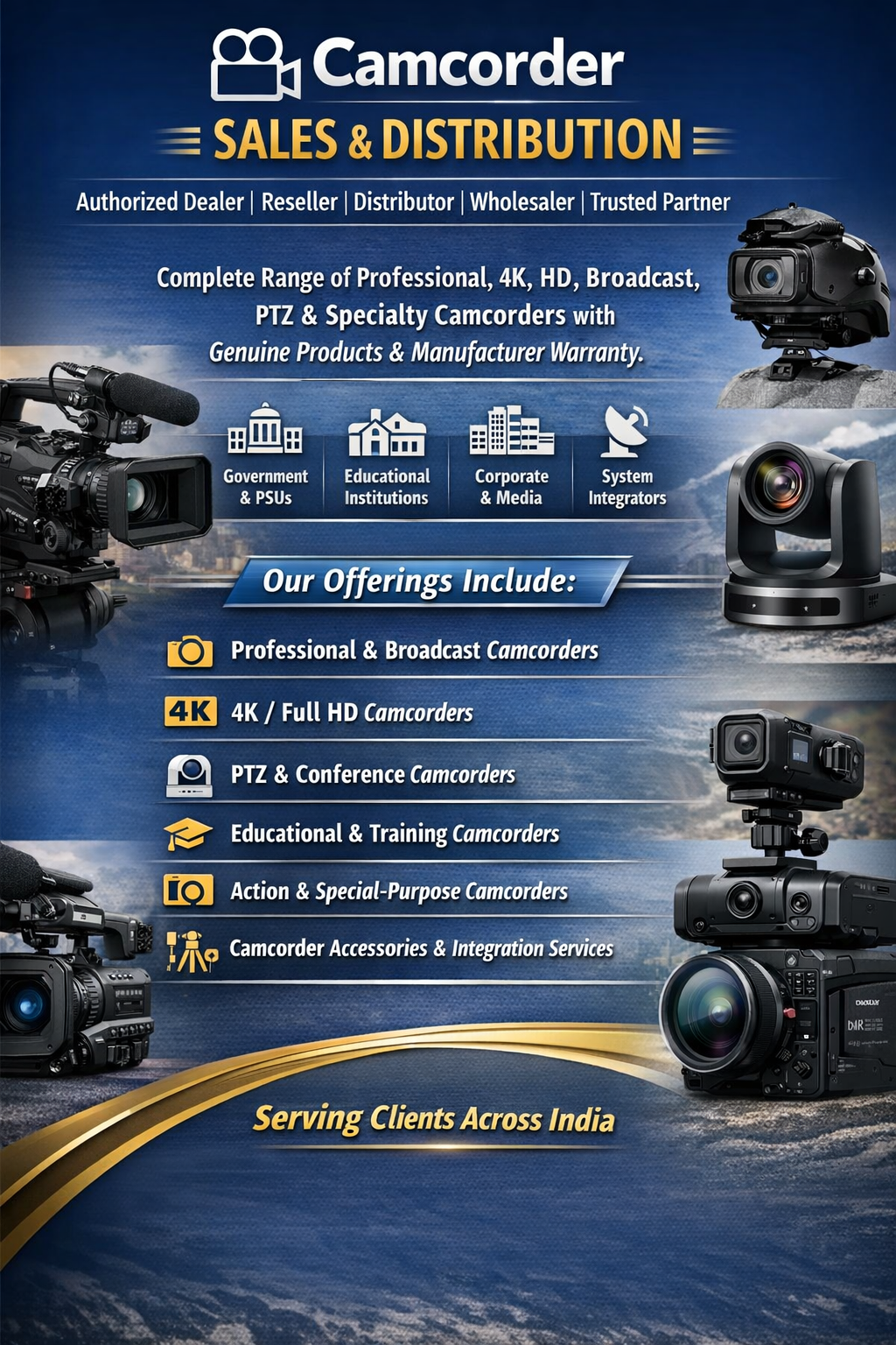 We deliver advanced camcorder solutions and professional camcorder video recording systems across India as a camcorder authorized partner, camcorder dealer, camcorder distributor, camcorder reseller, camcorder wholesaler and camcorder system integrator, providing end-to-end camcorder installation, camcorder configuration and camcorder commissioning for Central & State Government departments, PSUs, corporate offices, media houses, studios, educational institutions, universities, hospitals, police departments and Smart City command and control centers across Pan India.