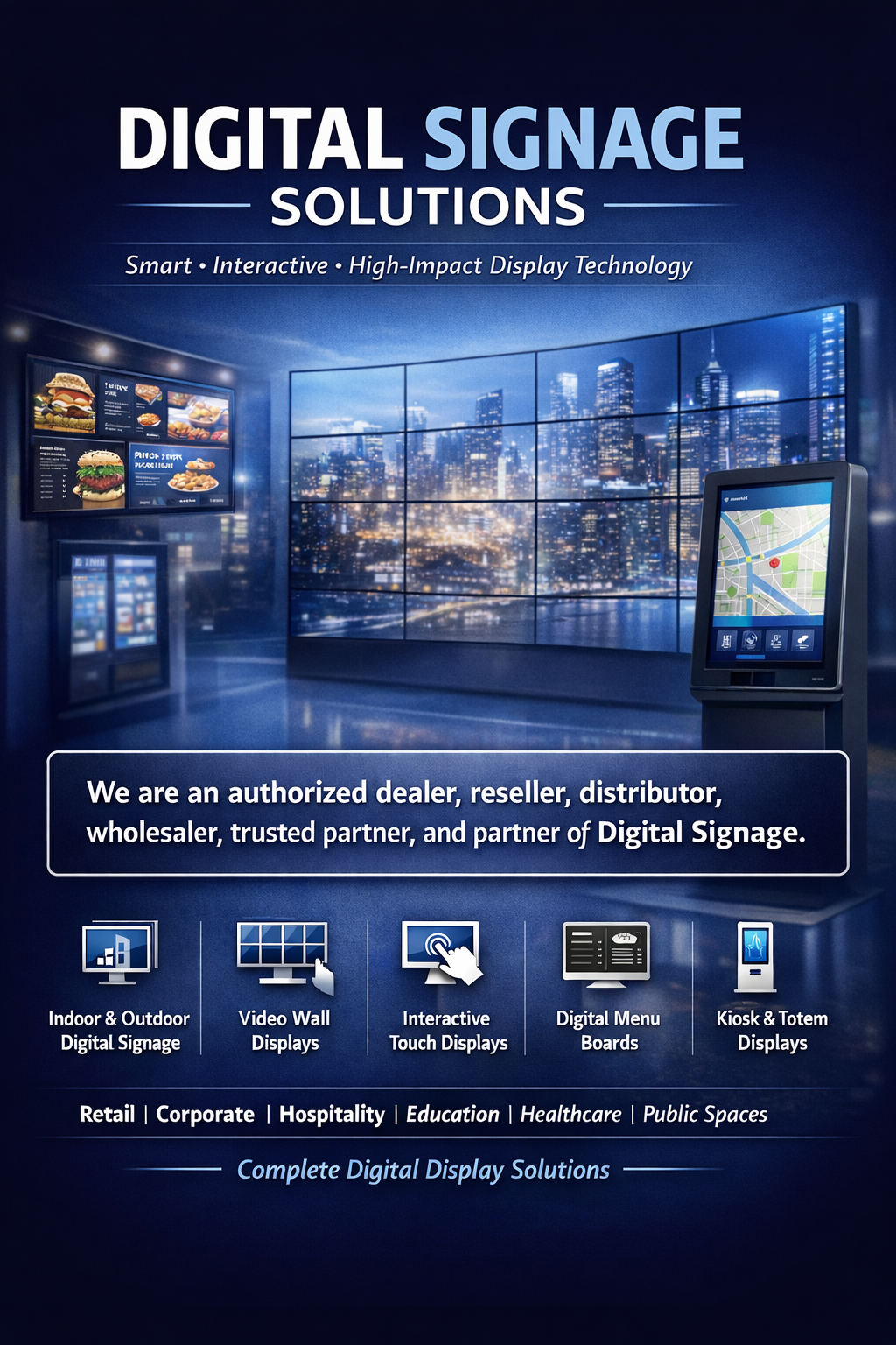 We deliver advanced Digital Signage solutions and professional Digital Signage display systems across India as a Digital Signage authorized partner, Digital Signage dealer, Digital Signage distributor, Digital Signage reseller, Digital Signage wholesaler and Digital Signage system integrator, providing end-to-end Digital Signage installation, Digital Signage configuration and Digital Signage commissioning for Central & State Government departments, PSUs, corporate offices, IT parks, hotels, boardrooms, schools, universities, hospitals, BPOs, call centers and Smart City command and control centers across Pan India.