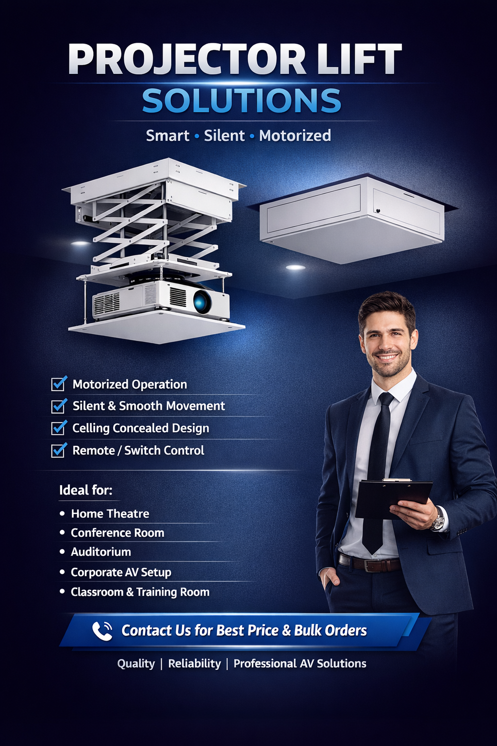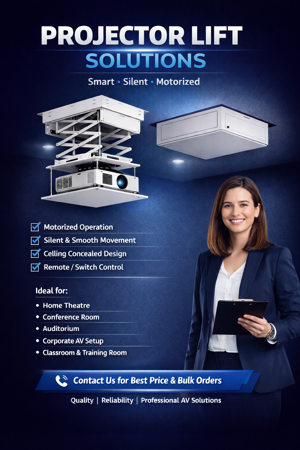 We deliver advanced Projector Lift solutions and professional Projector Lift systems across India as a Projector Lift authorized partner, Projector Lift dealer, Projector Lift distributor, Projector Lift reseller, Projector Lift wholesaler and Projector Lift system integrator, offering end-to-end Projector Lift deployment, Projector Lift installation, AV system integration and Projector Lift commissioning for Central & State Government departments, PSUs, corporate offices, IT parks, healthcare organizations, auditoriums, conference halls, schools, universities, hospitals, BPOs, call centers and Smart City AV infrastructure and digital visualization initiatives across Pan India.