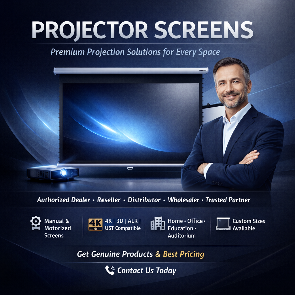 We supply motorized projector screens, manual screens, fixed frame screens, portable projector screens, ALR screens and large venue projection systems across Leh for offices, Smart Cities, banks, hospitals, training centers and digital workplaces.