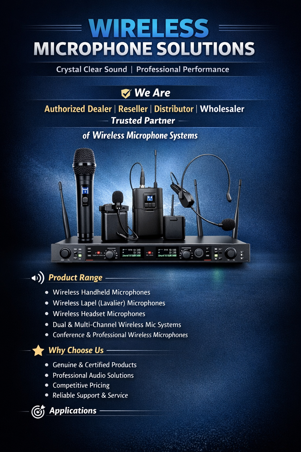 These Wireless Microphone solutions, professional Wireless Microphone display systems, commercial display solutions and enterprise display platforms are widely deployed across India for Central & State Government departments, PSUs, Defence organizations, Railways, Police departments, Smart City missions, educational institutions, healthcare facilities, corporate enterprises, hospitality projects and large-scale infrastructure developments. All Wireless Microphone and display systems are supplied by Sunlite Systems Pvt Ltd as a Wireless Microphone authorized distributor, Wireless Microphone Government supplier, Wireless Microphone GeM-registered vendor, Wireless Microphone tender supplier, Wireless Microphone importer and exporter, offering Pan-India delivery, Wireless Microphone installation, Wireless Microphone system integration, Wireless Microphone AMC, Wireless Microphone warranty support and long-term Wireless Microphone technical assistance across India.