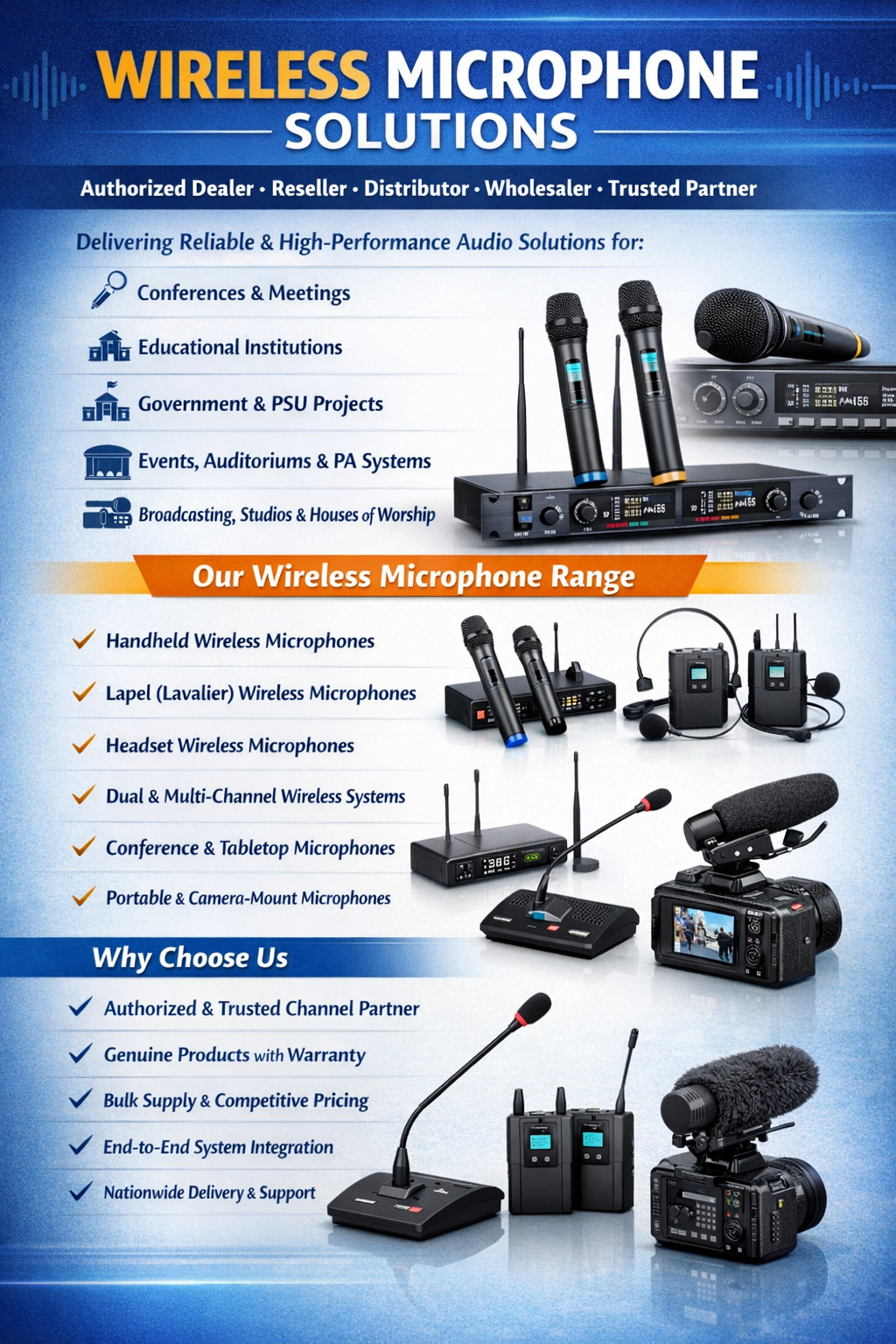 We supply professional Wireless Microphone and commercial display solutions with high-brightness professional Wireless Microphones, accurate color reproduction, crystal-clear high-resolution visuals, calibrated display performance and secure, centrally controlled display environments. These Wireless Microphone enterprise and Government-grade solutions are widely used by Central & State Government departments, PSUs, Defence organizations, corporate enterprises, banks, educational institutions, hospitals, BPOs and Smart City command and control centers for reliable, high-performance, scalable and secure Wireless Microphone and display deployments across India.